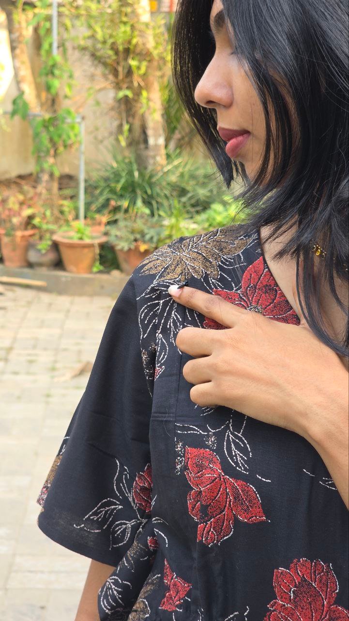Gentle hand wash only. Use mild detergent. Do not soak or scrub. Dry inside out in shade; avoid direct sunlight. Block-printed fabrics may bleed slightly due to natural dyes-this is normal.